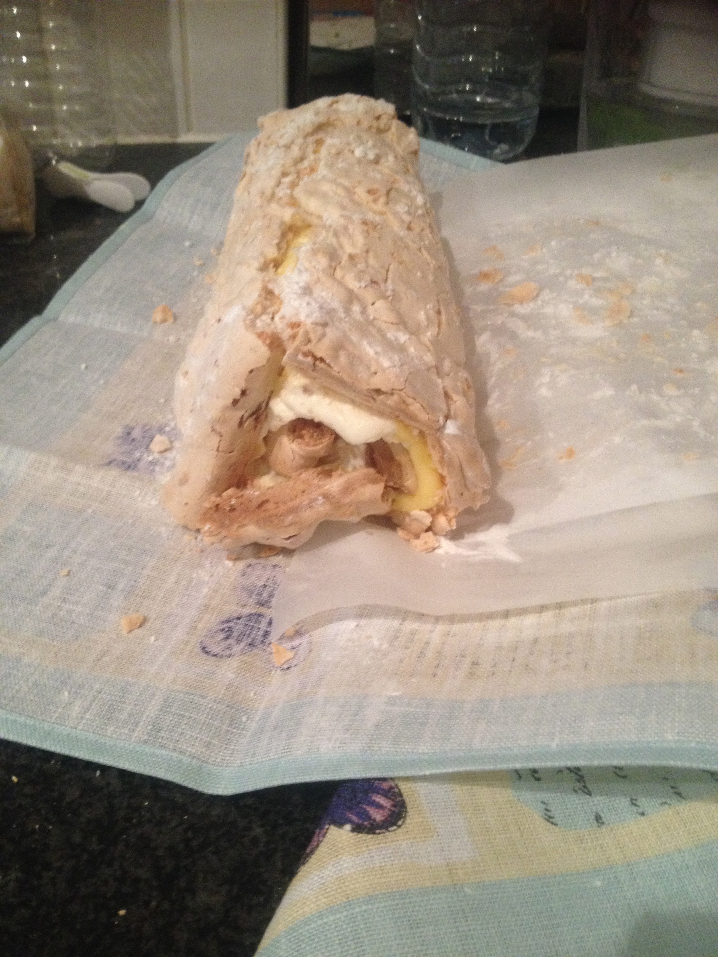 With some much appreciated help, guidance and advice from the best chef in the world, my mummy of course, we decided a roulade would be a good meringue based dessert (without needing a freezer to get it to the studios) and decided on a lemon and almond roulade with chocolate (essential) decorations. However, I had never made one before. The lemon curd, mascarpone and crème fraîche fillings were simple enough to whip together, but several whats’app messages and photos were exchanged between mother and daughter to make sure the meringue was ‘glossy’ enough and baked to perfection. Then, it was just a case of rolling it up. Easy. I made a note not to ‘score’, or as Ian off the Bake Off did, slice his sponge (albeit not meringue) to roll.