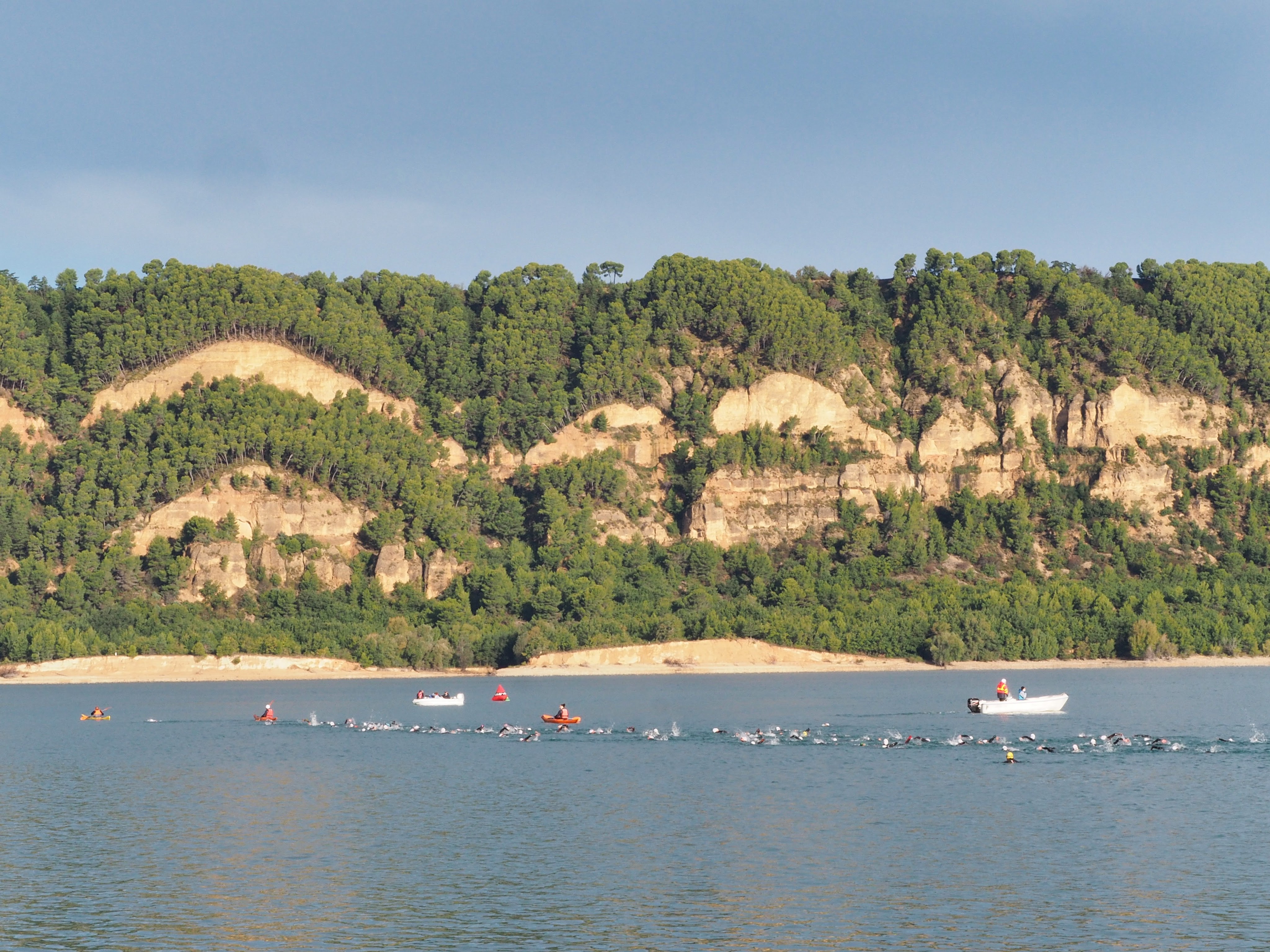 Helen and Ceri, who were stood behind me in the next wave, said they saw me take a smooth line straight to the first buoy. A good start! However, the diagram in my head of the positioning of the buoys wasn’t quite the reality, and as I turned around the 1st buoy all I could hear was “gauche, gauche, gauche”. I couldn’t believe how much further left I needed to go, but after trying to sight (and my eyesight is getting worse) with the sun glaring into my eyes, I just about made out the next buoy, only to be stopped by a gentleman in a kayak telling me I was going the wrong way. I quickly corrected him, and he let me continue. Honestly!